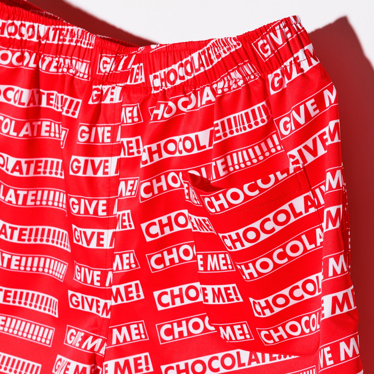 GIVE ME CHOCOLATE!ロゴがテキスタイルになっているショートパンツです。 ポリエステル100% ※こちらの商品は【受注商品】となっております。お届けまでに3週間ほどお時間頂きますので、ご了承下さい。